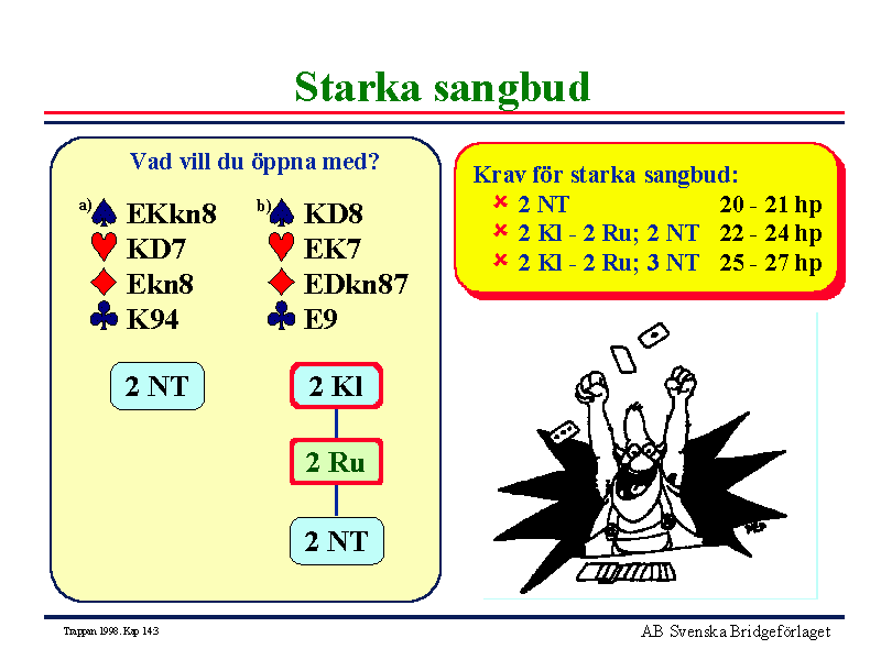 - Visa hand b.Hur många hp? - 23 hpVad bjuder du? - 2 Kl - 2 Ru - 2 NT. Budet visar 22-24 hp. Budet 3 NT tar för mycket budutrymme.