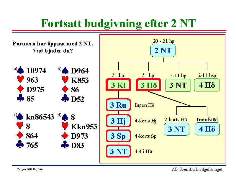 - Visa hand a.Vad bjuder du? - Pass. Resonera dig fram till svaret på samma sätt, som du gjorde vid 1 NT-budgivningen (20 hp + 2 hp= 22 hp).